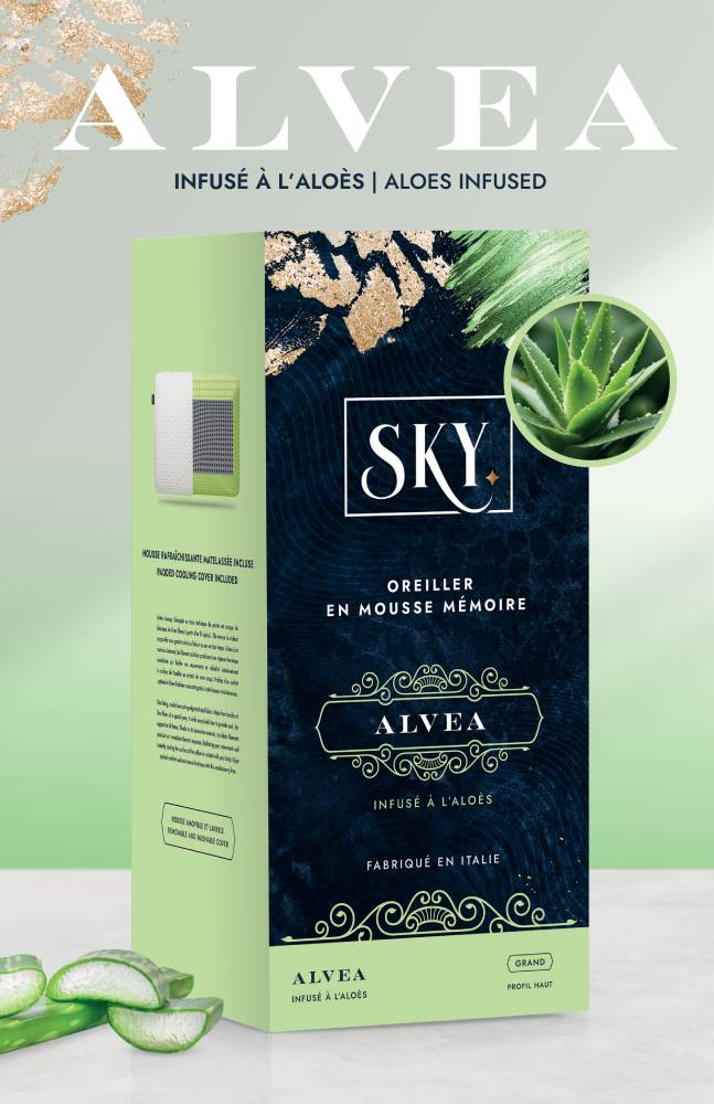 Oreiller viscoélastique infusé à l’aloès, doté de la technologie MCP pour un confort rafraîchissant qui s’adapte à la température de votre corps. Sommeil profond, sans micro-réveils.